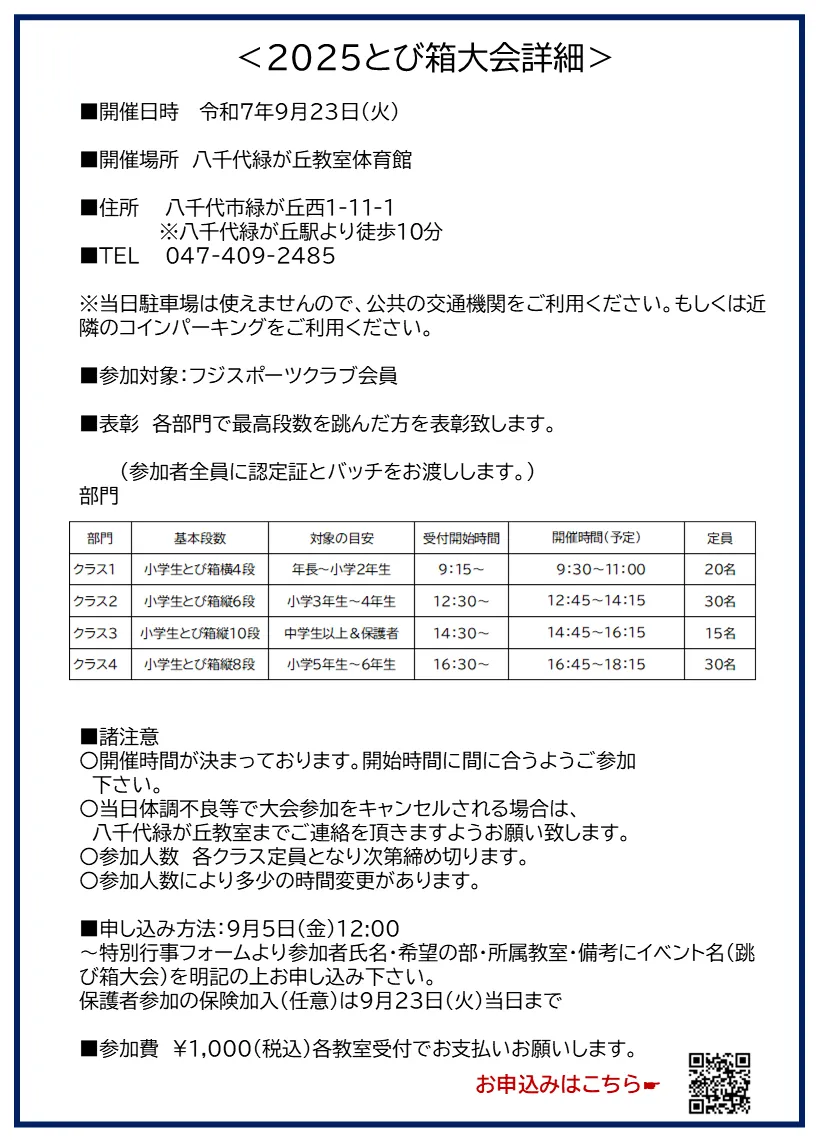 とび箱大会の申し込みが開始となりすでにクラス1が定員となりました。